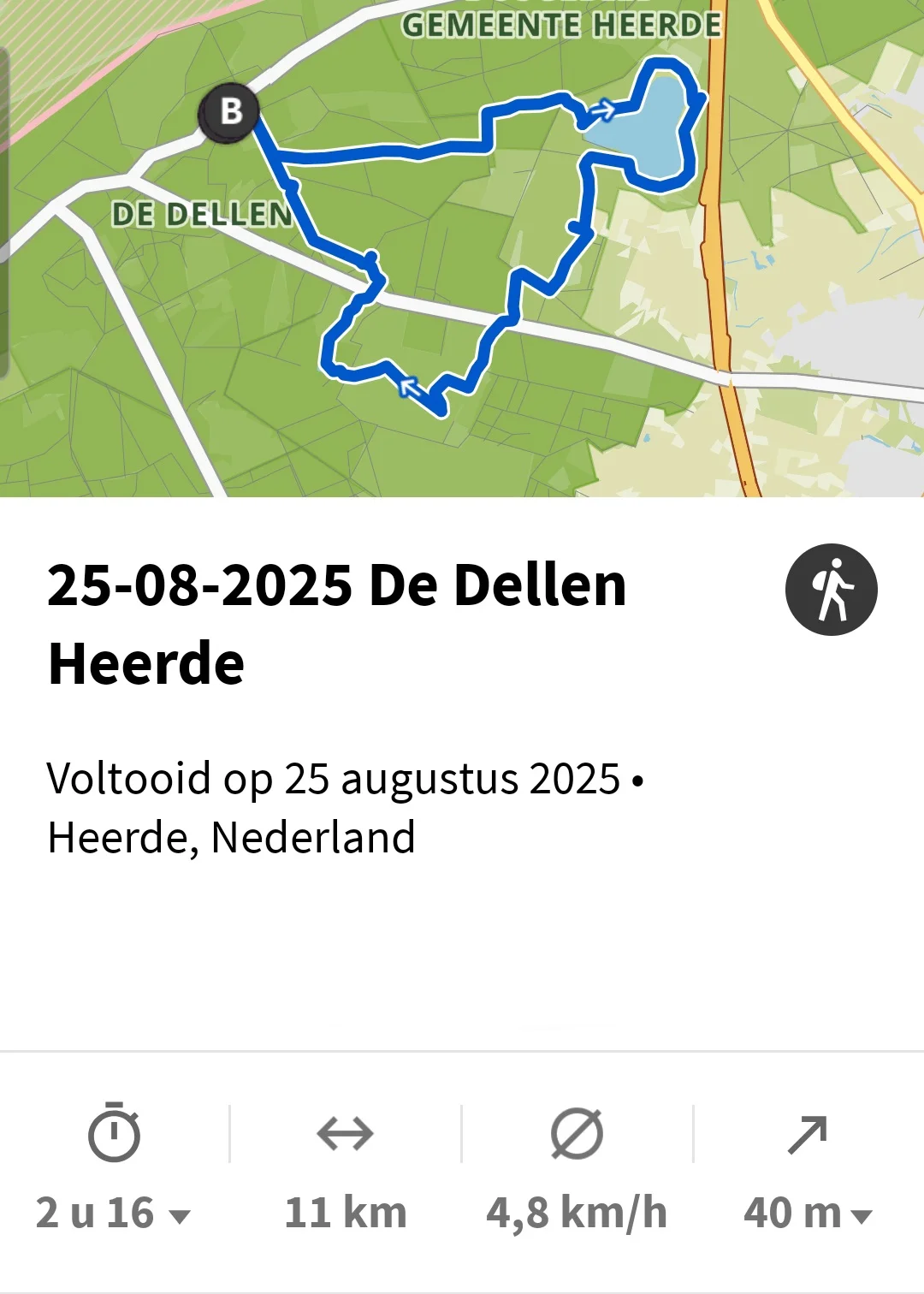 Na het groeten van die vier liefhebbers die mij al giebelend nakeken, vervolgde ik mijn weg, waarbij ik mezelf nog even een kort rustpauze gaf met een drankje. Daarna ging het weer verder richting een uitgestrekte heide waar in de verte een schaapkudde loom liepen te grazen, alsof ze de rust zelve waren en niet de minste haast hadden. Vervolgens kwam ik het bosgebied van Heerde weer binnen, en zag ik aan het eind van mijn wandeling nog een oude, drooggelegde vijver uit de vorige eeuw. Een stille getuige van vervlogen tijden.
